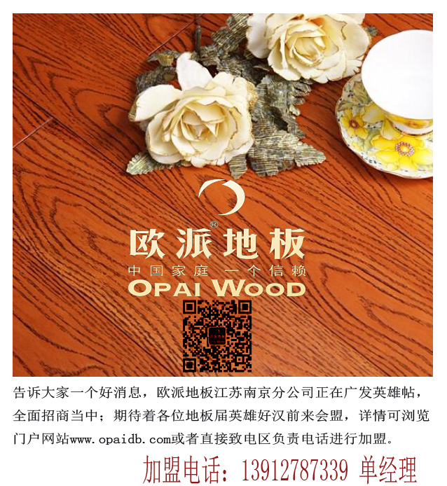 告訴大家一個好消息,歐派地板江蘇南京分公司正在廣發英雄帖,全面招商當中;期待著各位地板屆英雄好漢前來會盟,詳情可瀏覽門戶網站或者直接致電區負責電話進行加盟,加盟電話:13912787339 單經理